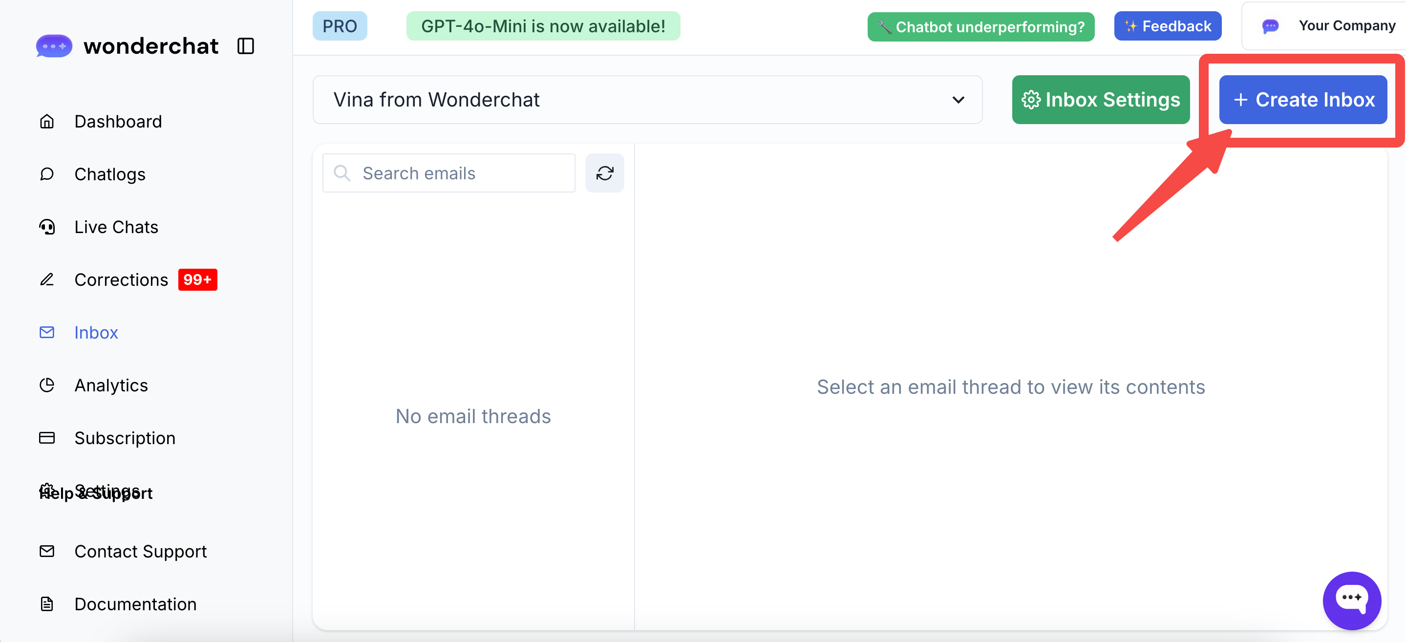 - Navigate to the Inbox Tab: Start by clicking on the "Create Inbox" button on your WonderChat dashboard.