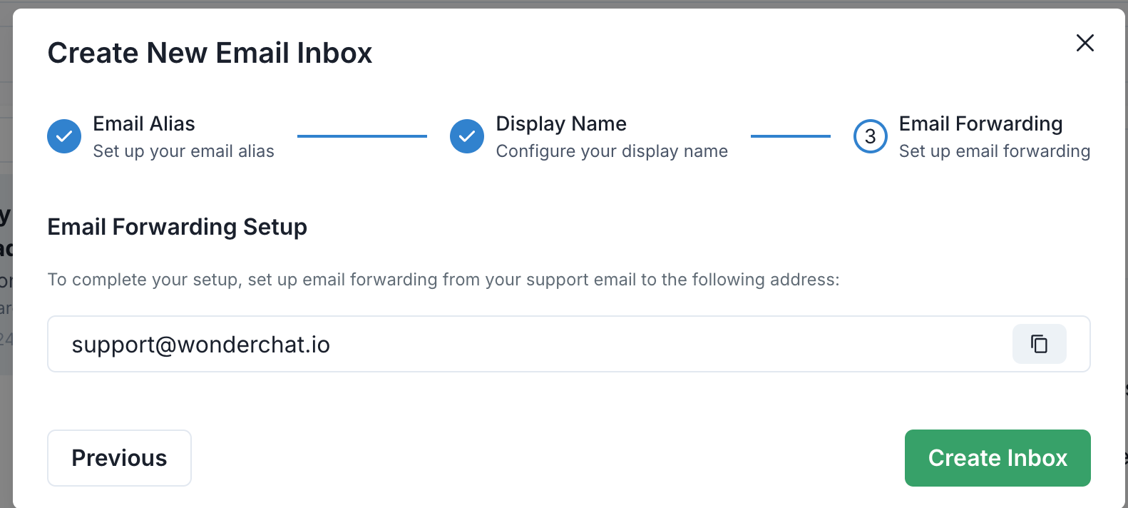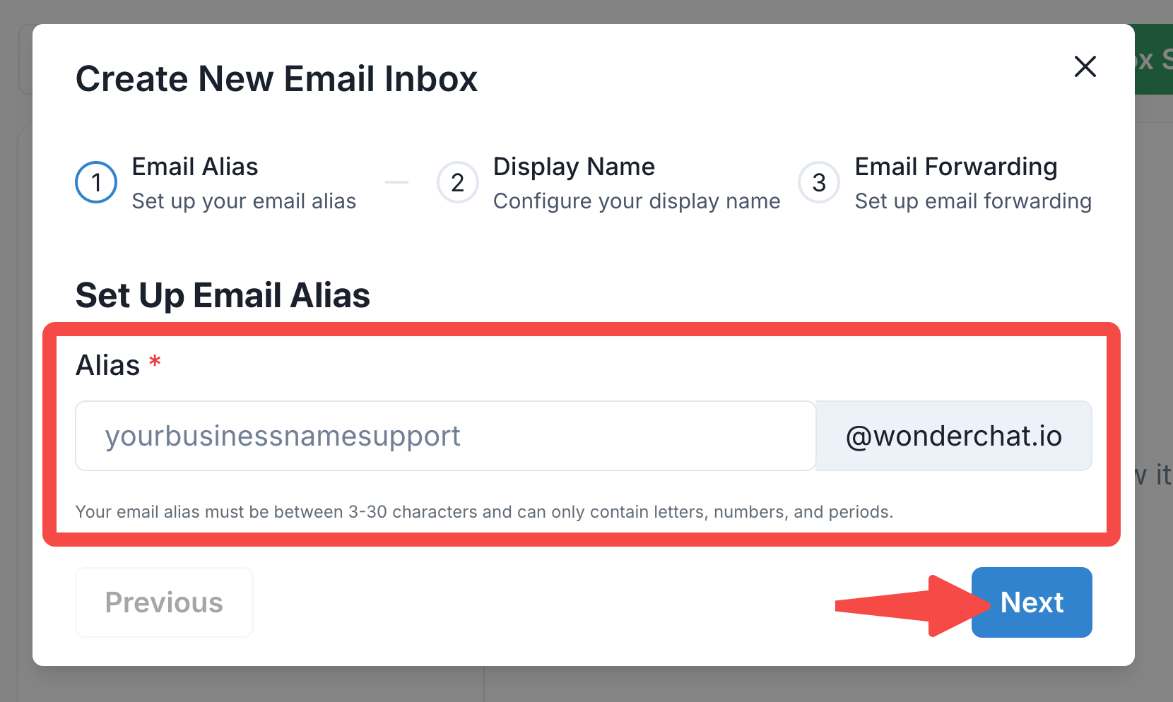 - Enter an email alias that you want to use for this inbox. The alias is the unique identifier that will be connected to your WonderChat bot.