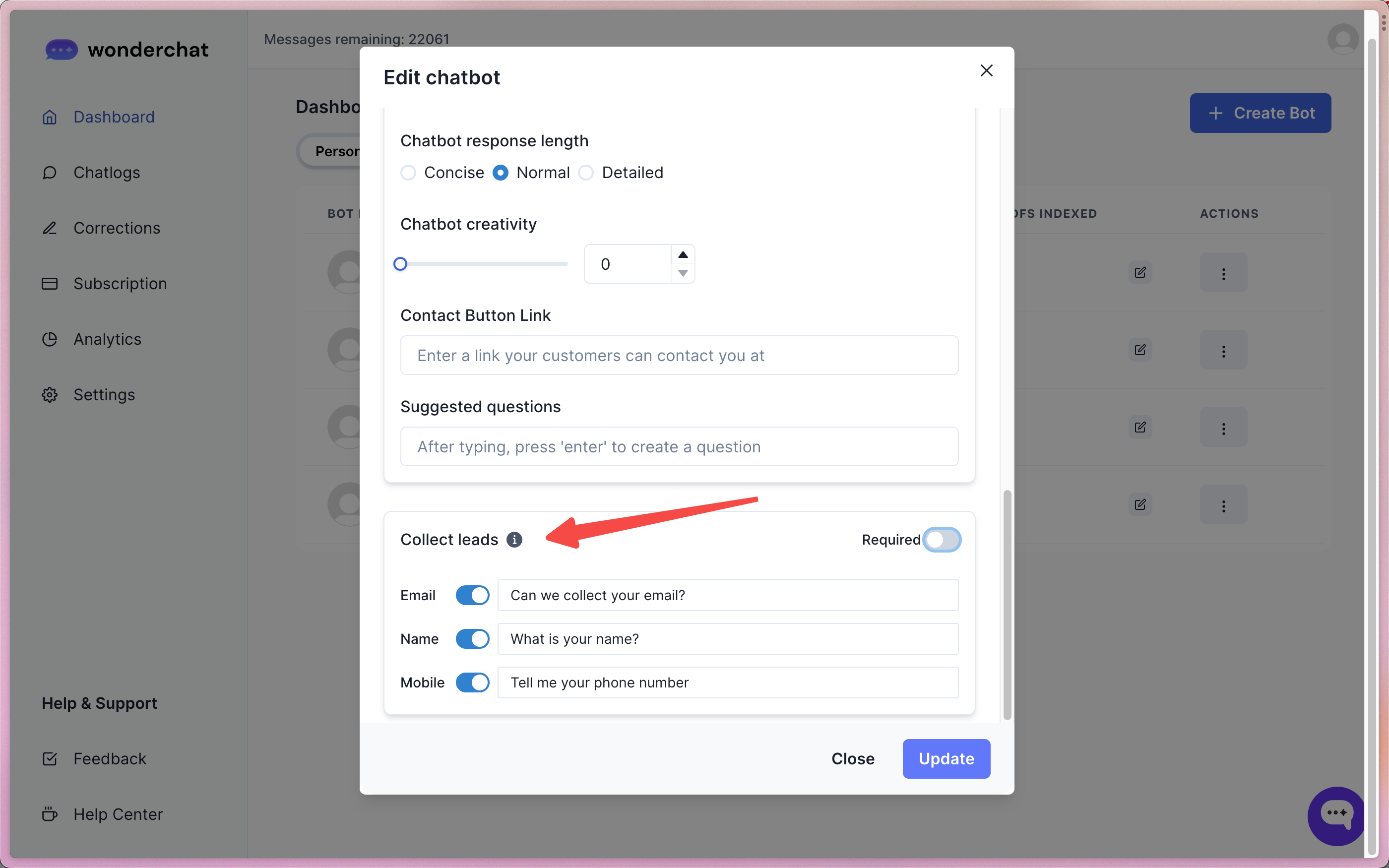 - To add enabled sales leads collection, go to “edit chatbot” or the “create a chatbot page” and scroll all the way down.