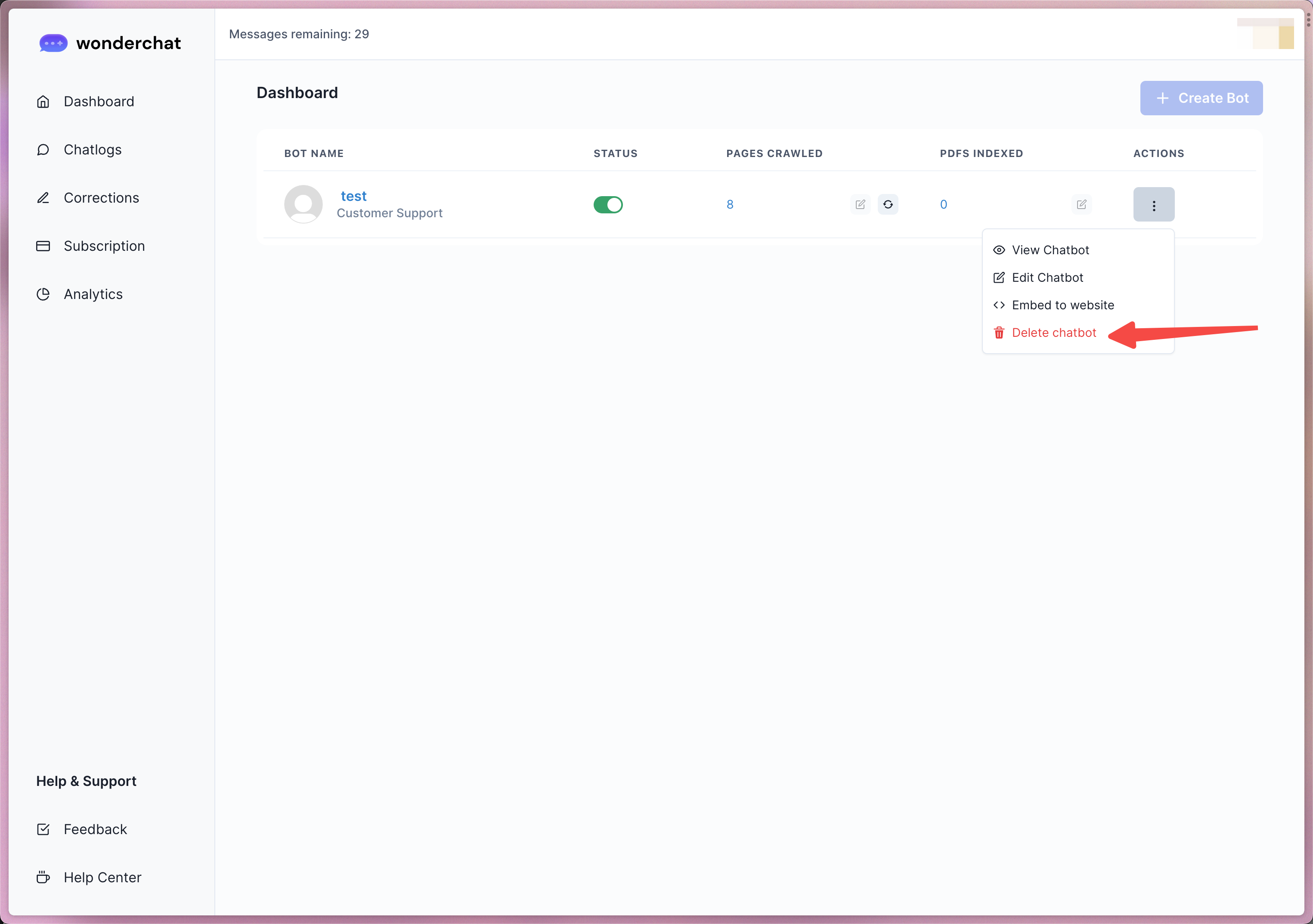 - Once deleted, the chatbot will no longer be on your dashboard.
