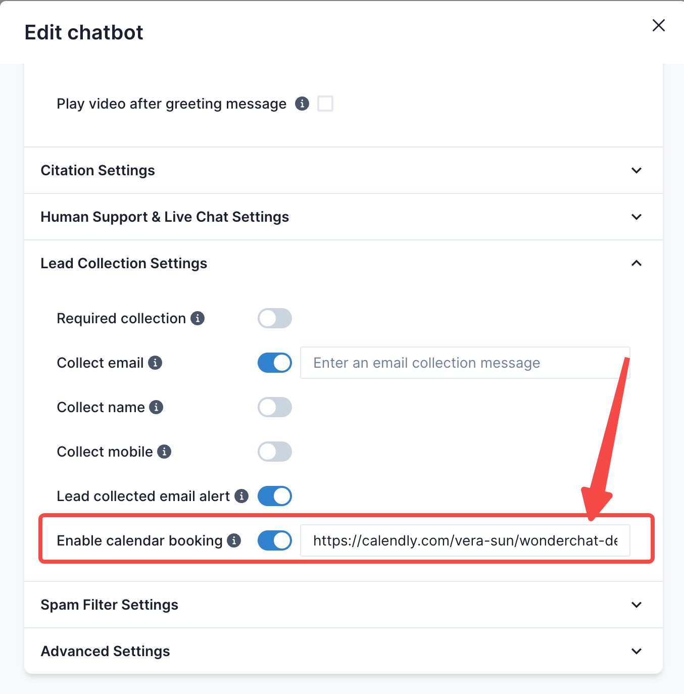 - Navigate to the Leads Collection Settings > Enable Calendar Bookings to turn on the calendly booking feature