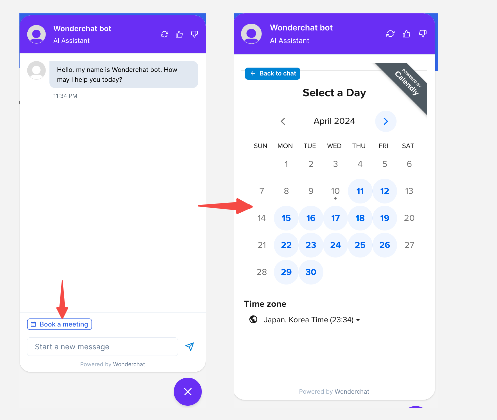 - Upon update, your users would be able to see a “Book A Meeting” button within the chatbot and to subsequently book a meeting with the owner of the calendly chatbot