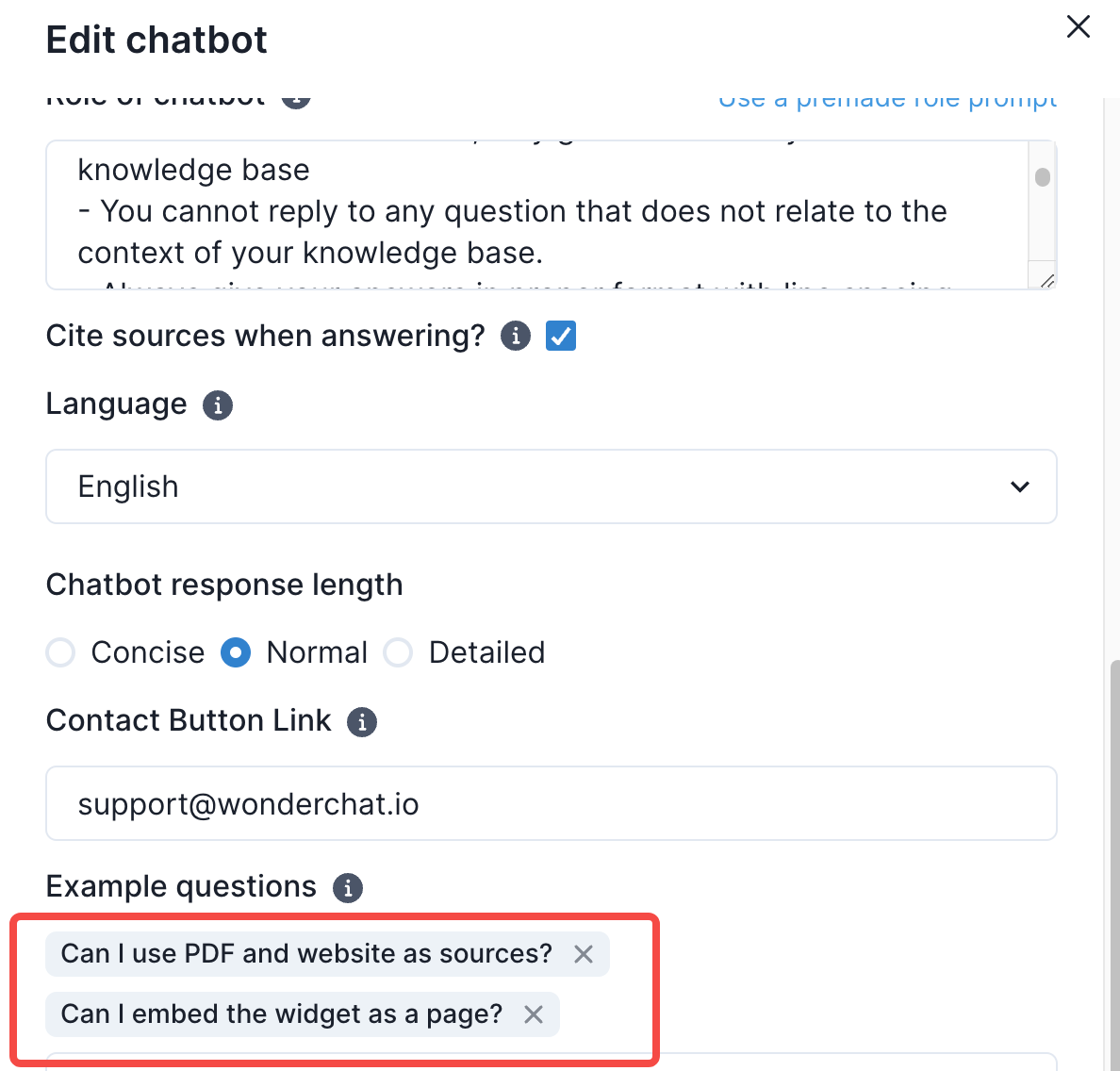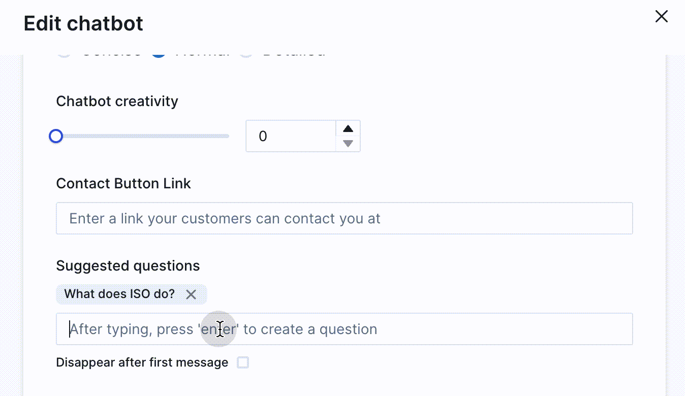 - To setup, go to the Dashboard > Edit Chatbot > General Settings menu and key in your quick questions within the ‘suggested questions’ label as shown