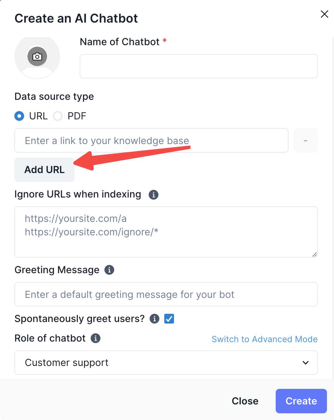 By clicking on Create Bot, you can have the option to “Add URL” to your chatbot so that it can be built from mutliple website links.