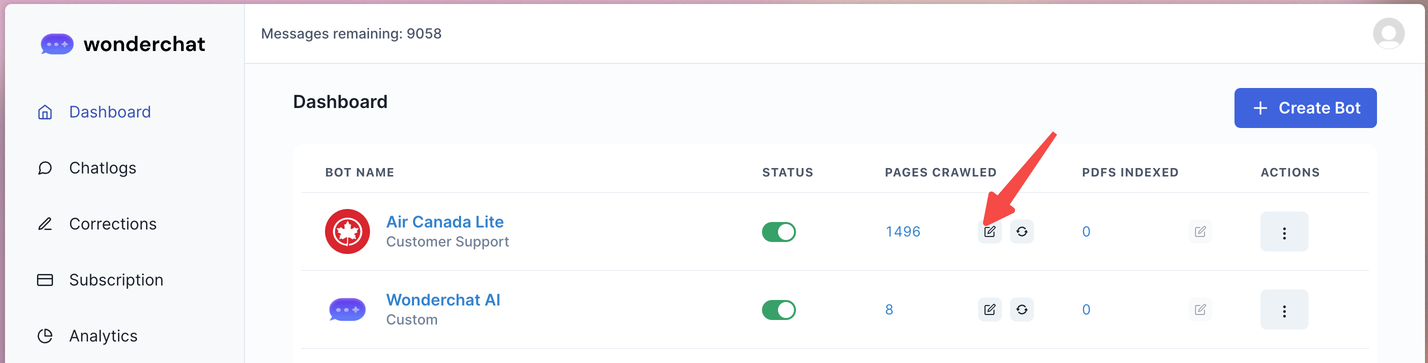 Once you have a chatbot that is ready-made and in place, you can click on the “Edit” icon under the “Pages Crawled” column.