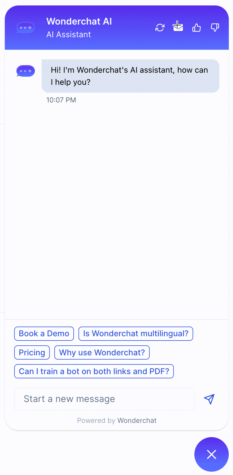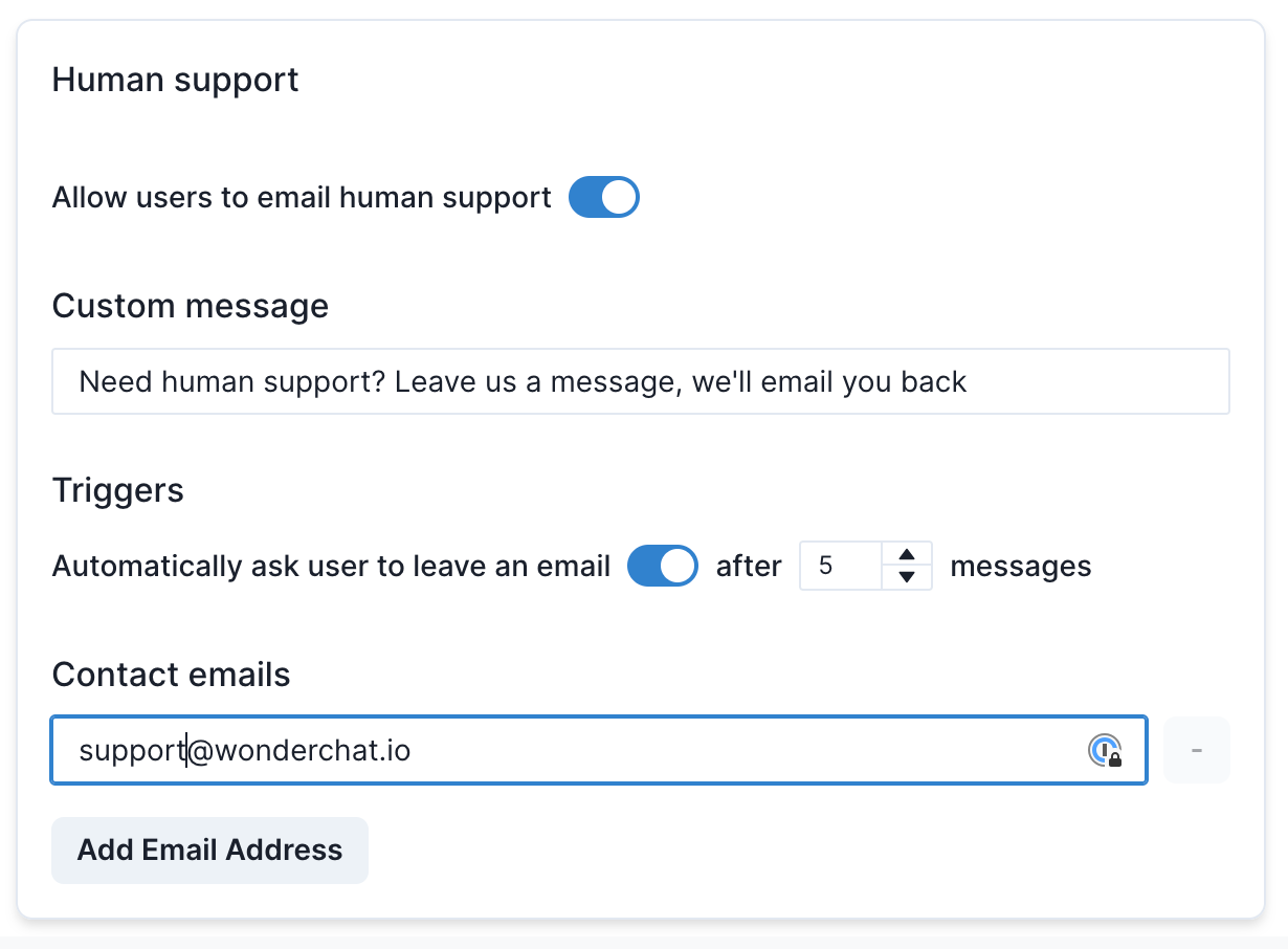 - Switch on the ‘allow users to email human support’ feature, which would allow for a user to leave a feedback to Wonderchat if AI is unable to respond to any queries.