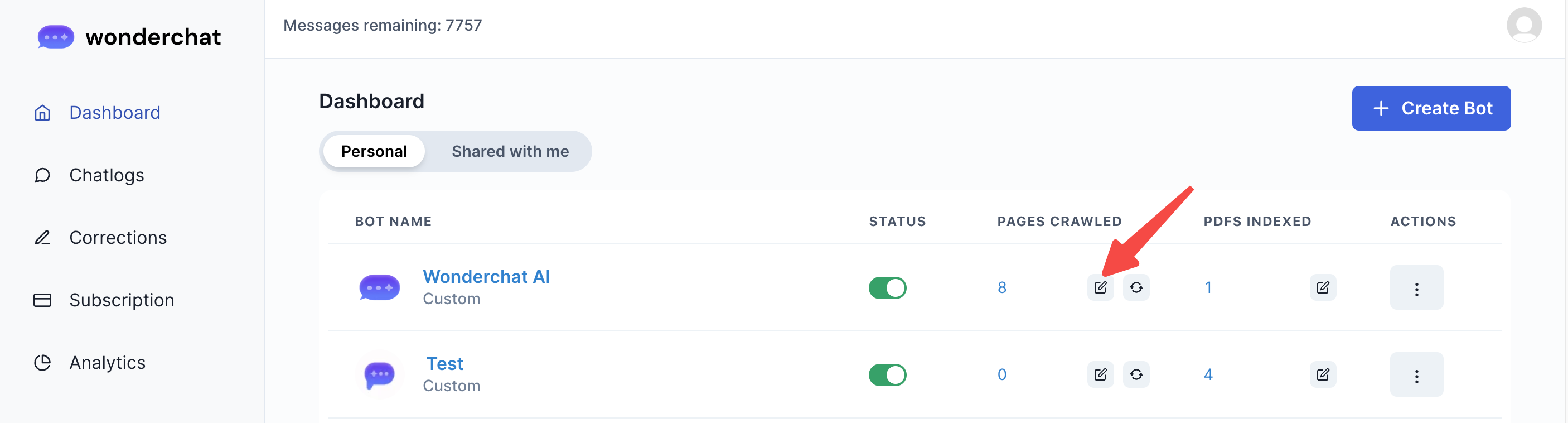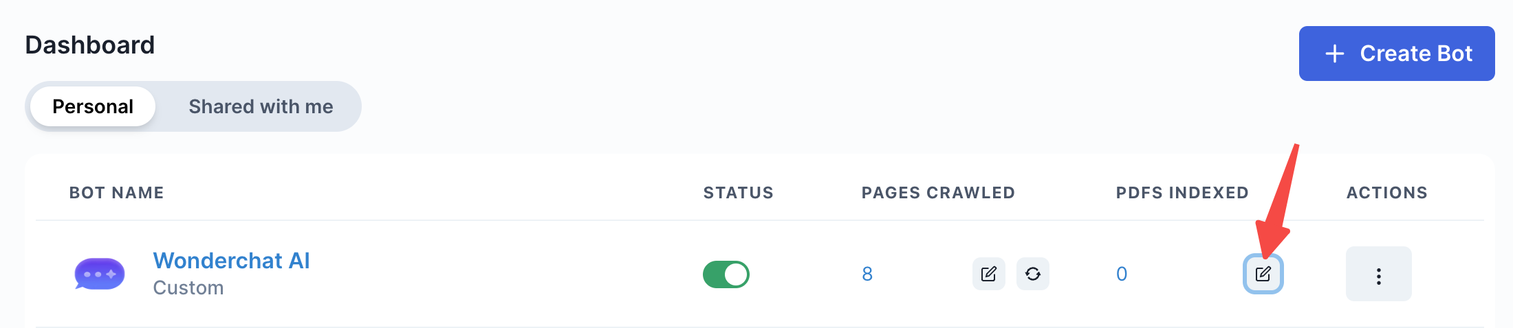 1. Click on the sitelinks edit button that is available from your existing chatbot with pages already stored.