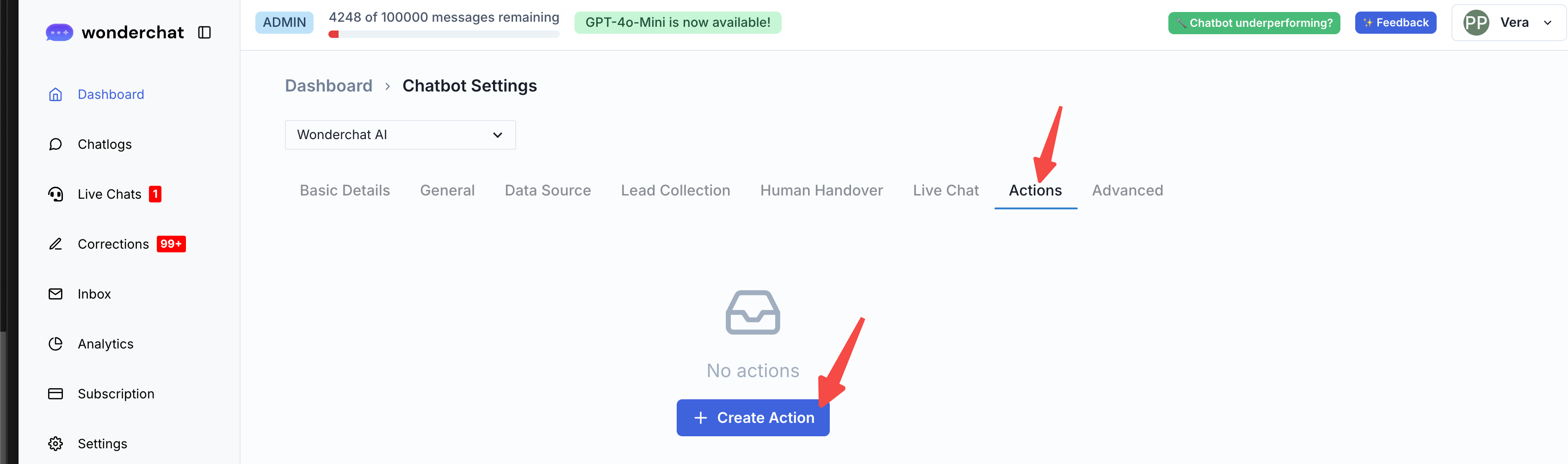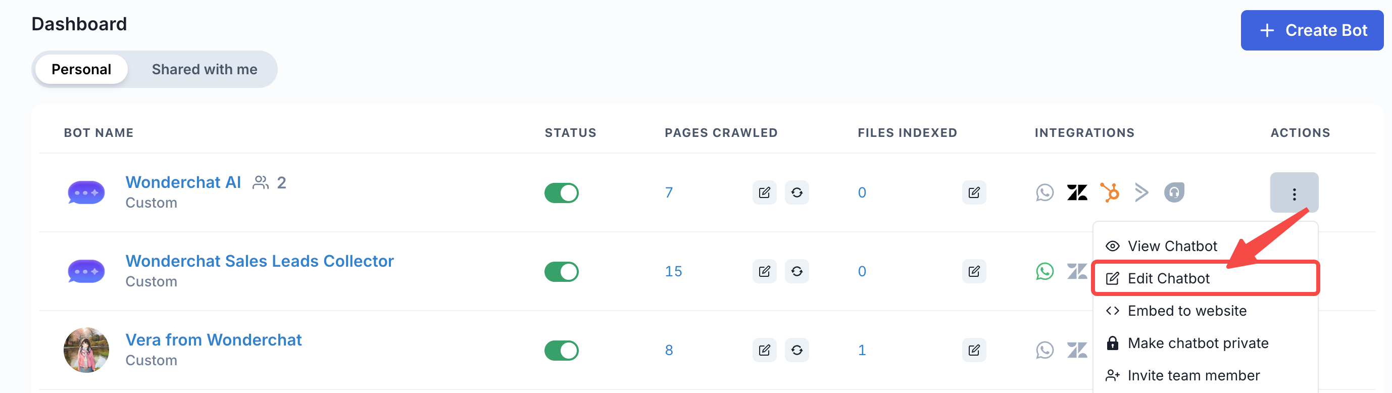 - To create a Wonderchat action, select the chatbot of your choice and click on “Edit Chatbot”