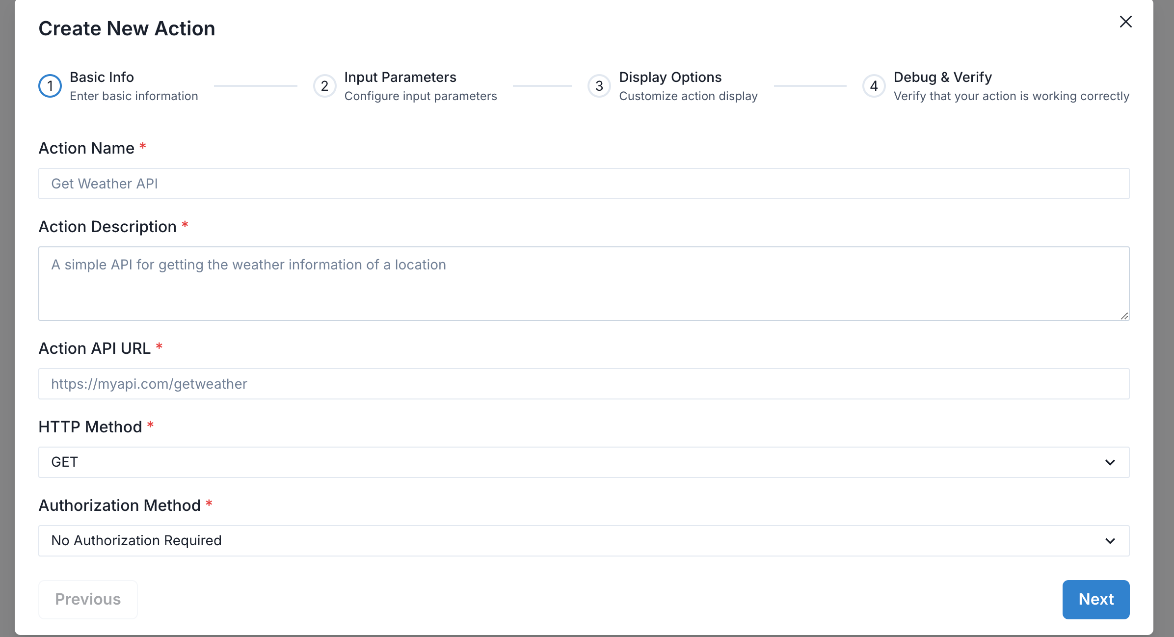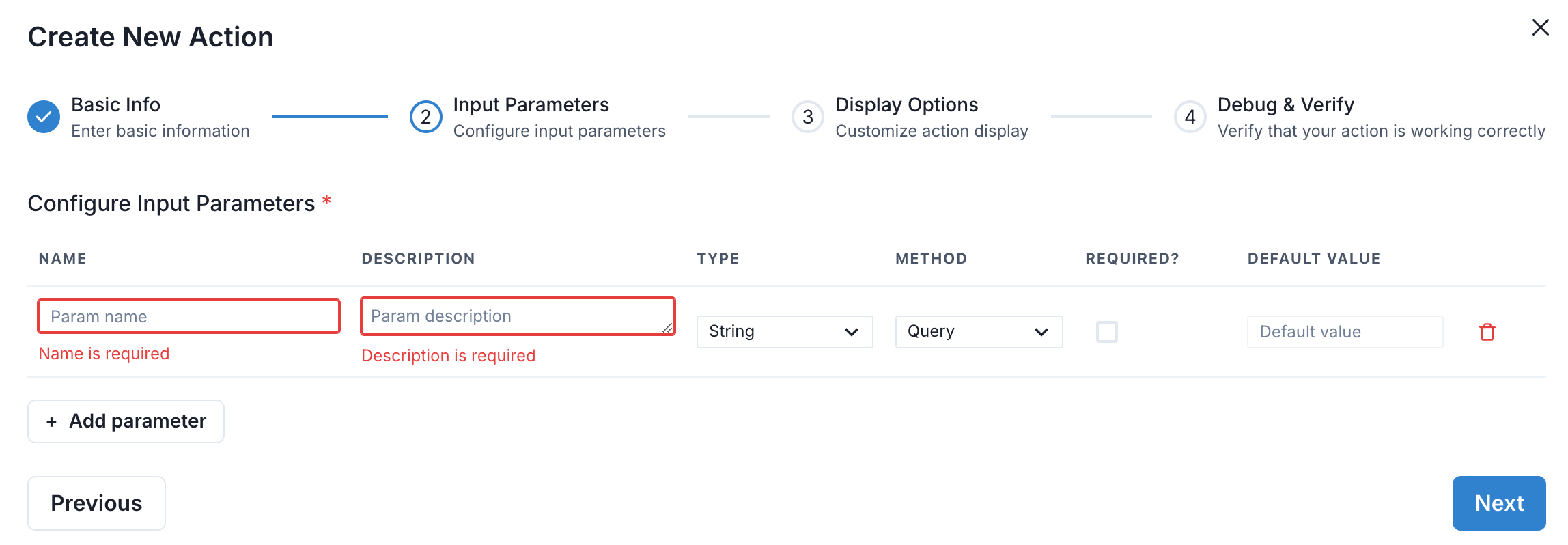 After setting up the basic information, you'll need to define the input parameters for the action.