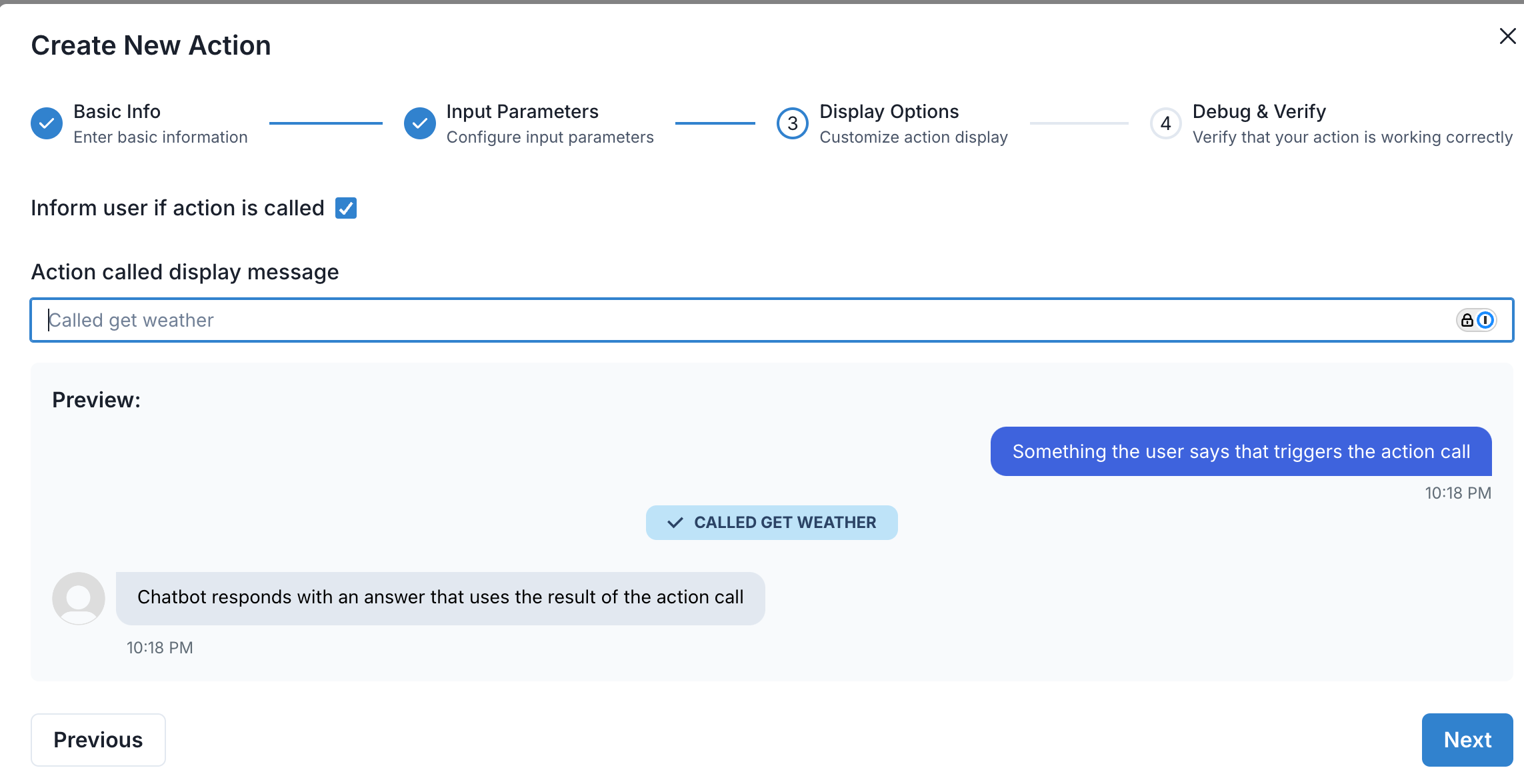 Once your action is created, it can be integrated into your chatbot's workflow. You can set triggers for this action based on specific user inputs or events within the chat.
