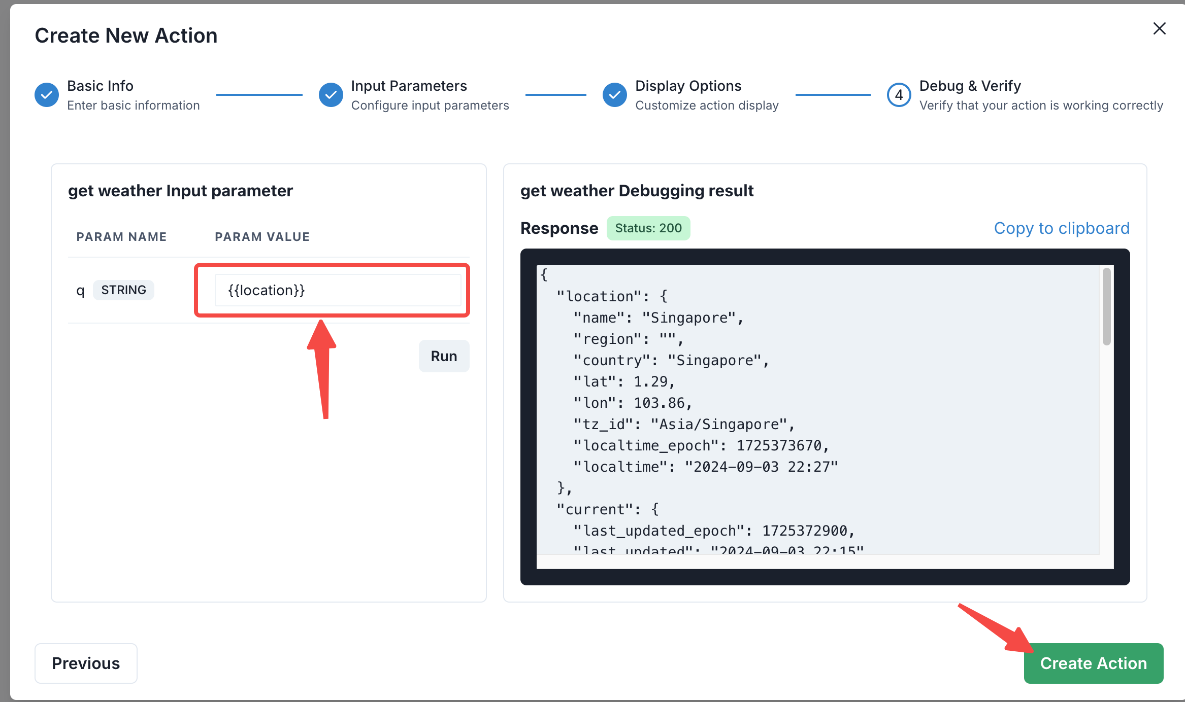 Get Weather APIaction, pass theSingaporelocation as a parameter, and return the current weather information using the API response.