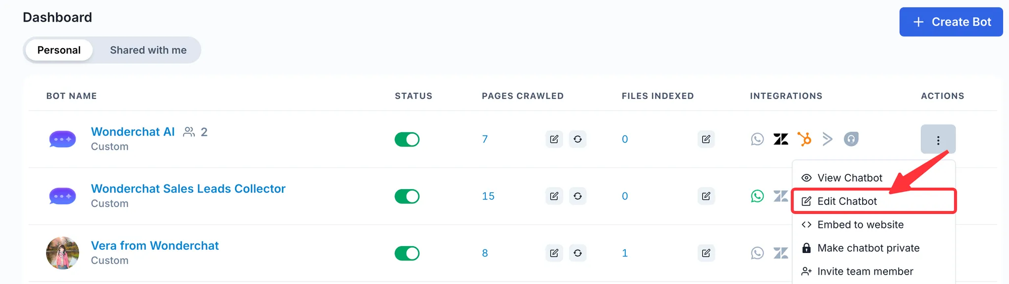 1. To create a Wonderchat workflow, select the chatbot of your choice and click on Edit Chatbot