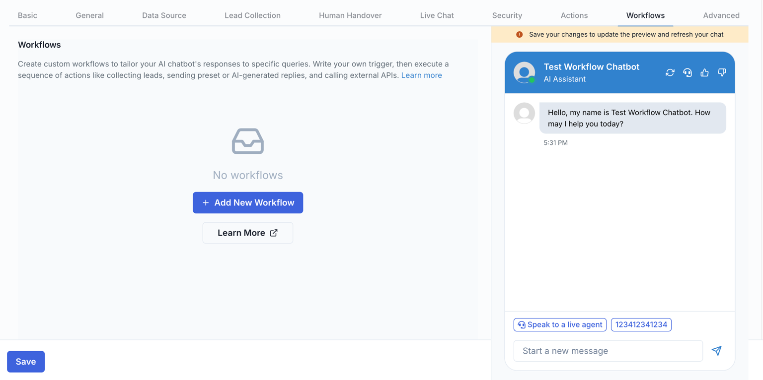 - Now that we have created our workflow, we can test it out by clicking Save and asking the chatbot a question that will trigger the workflow in the chatbot preview on the right.