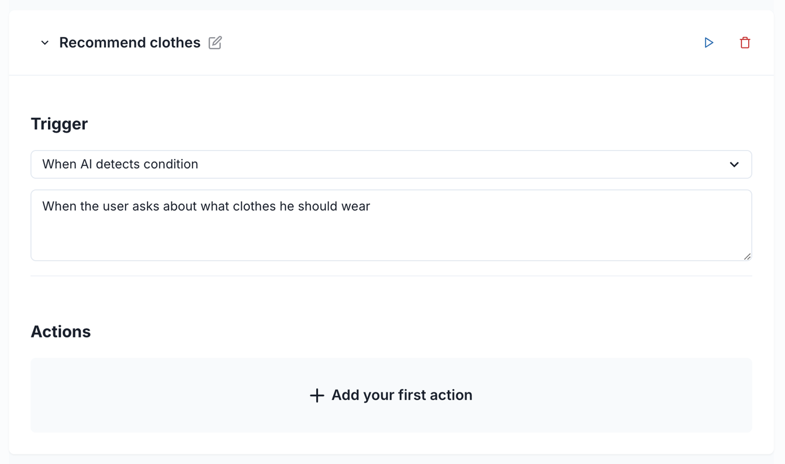 - A new workflow will be added. You can first select the type of trigger for your workflow. Here, we will select the When AI detects a condition trigger, and set the trigger when The user asks what clothes he should wear