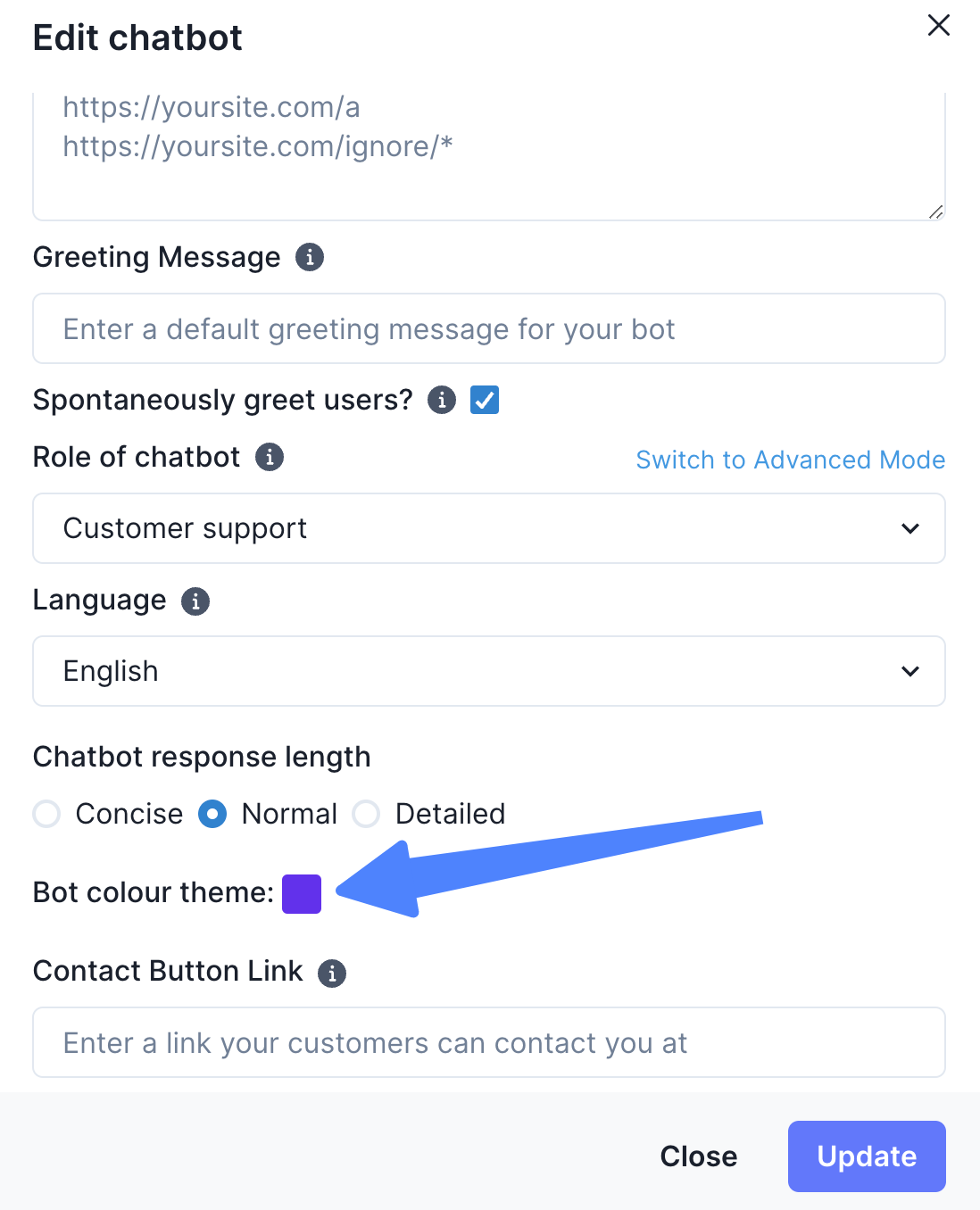 Once you decide on your profile picture and chat color theme, you can click on “Update” and your Chatbot should look ready to go!