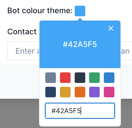 - By selecting on “bot color theme”, you can then check out the standard colors available for you to choose from. Click on the color of your choice to change the Chat interface color.