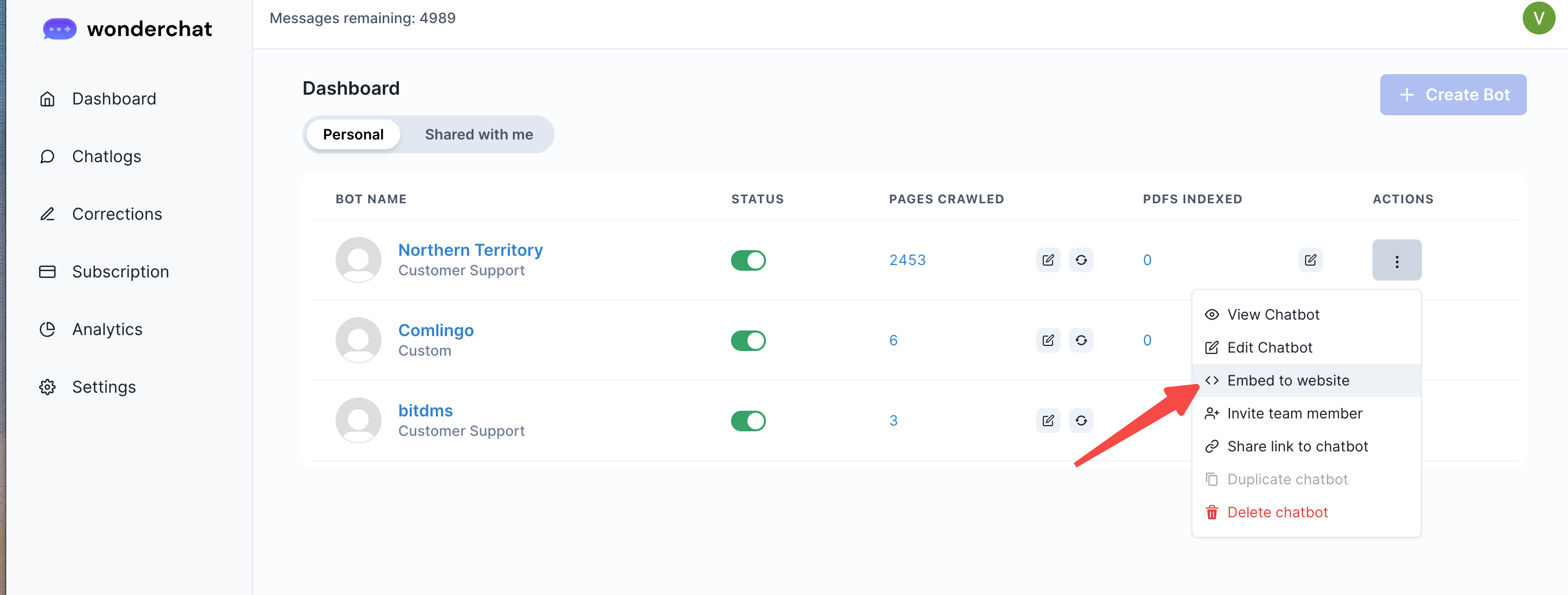 - Navigate to your dashboard and click on “Edit Chatbot”