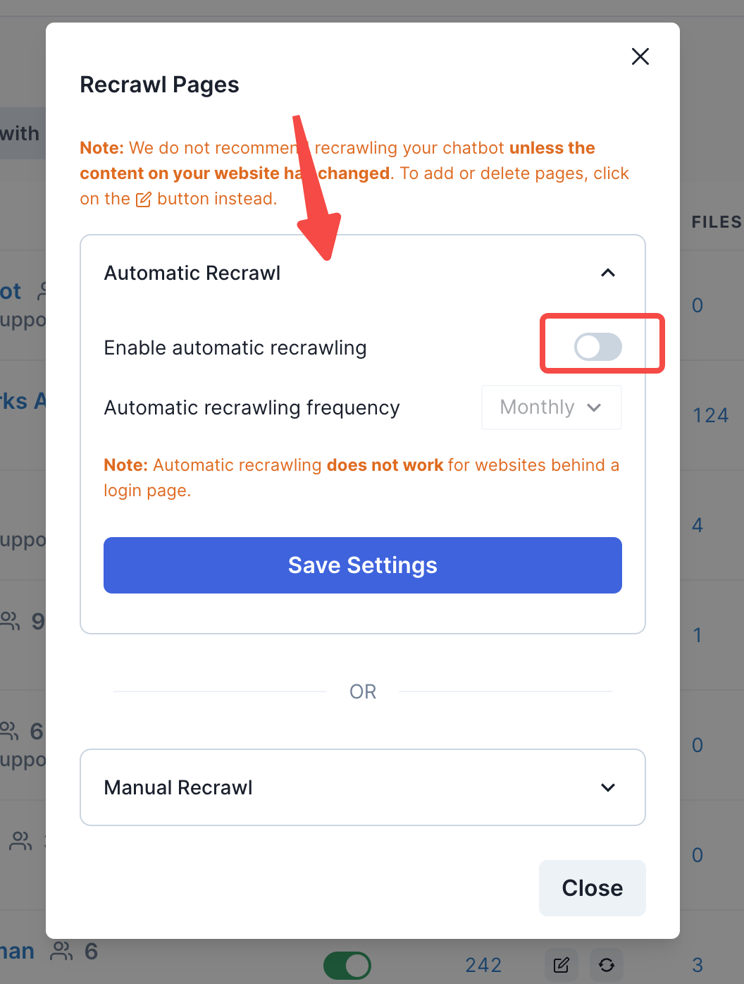 - Select “automatic recrawl” and click on “enable automatic recrawling”