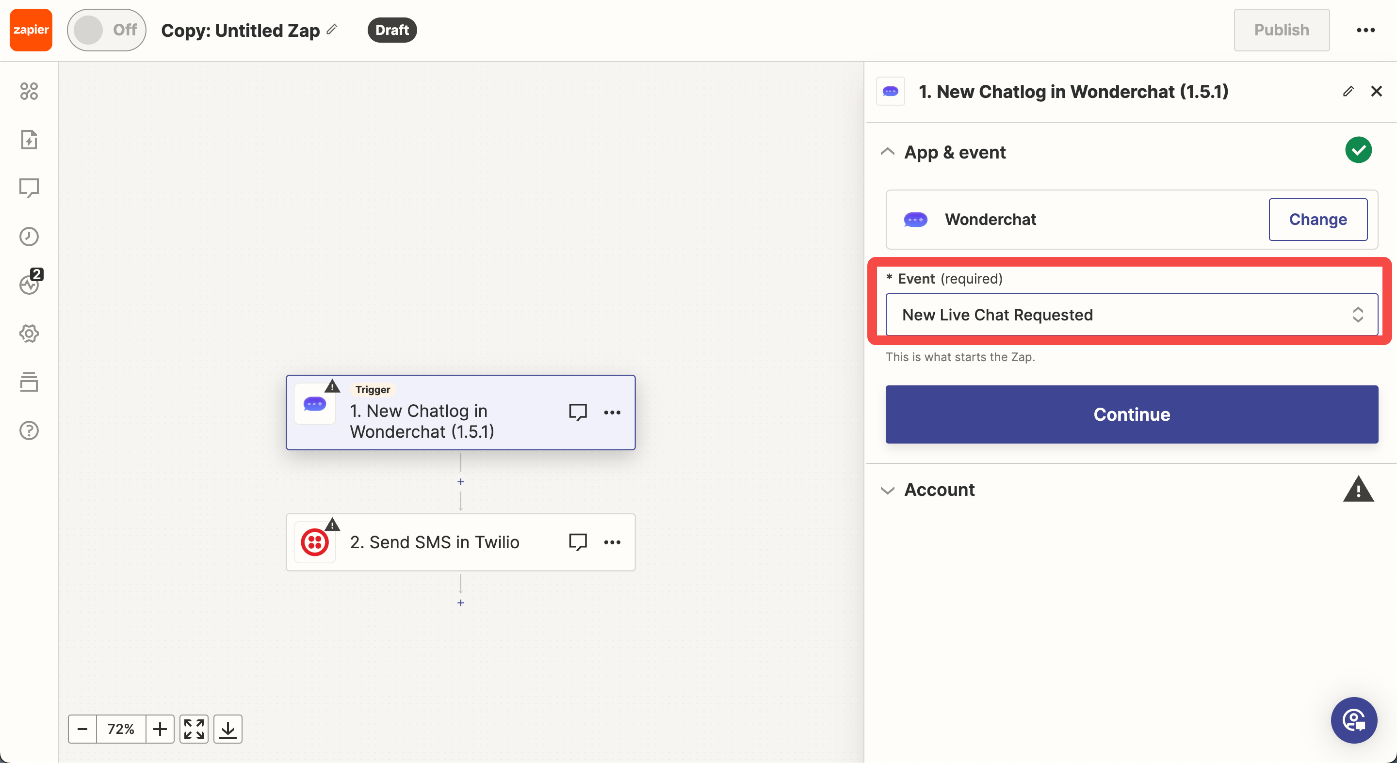 - Select Wonderchat as the trigger app, and set the ‘event’ to be ‘new live chat requested’.