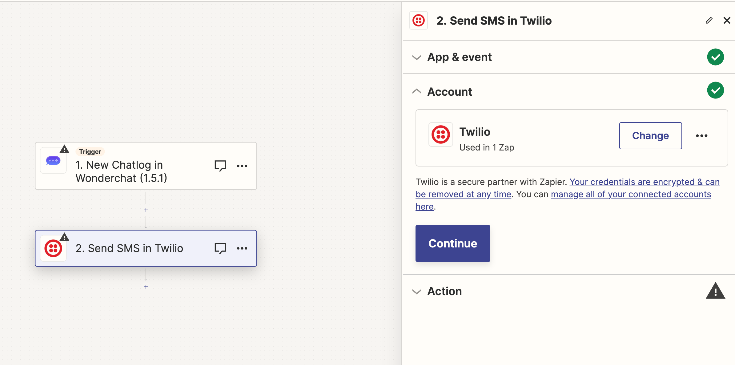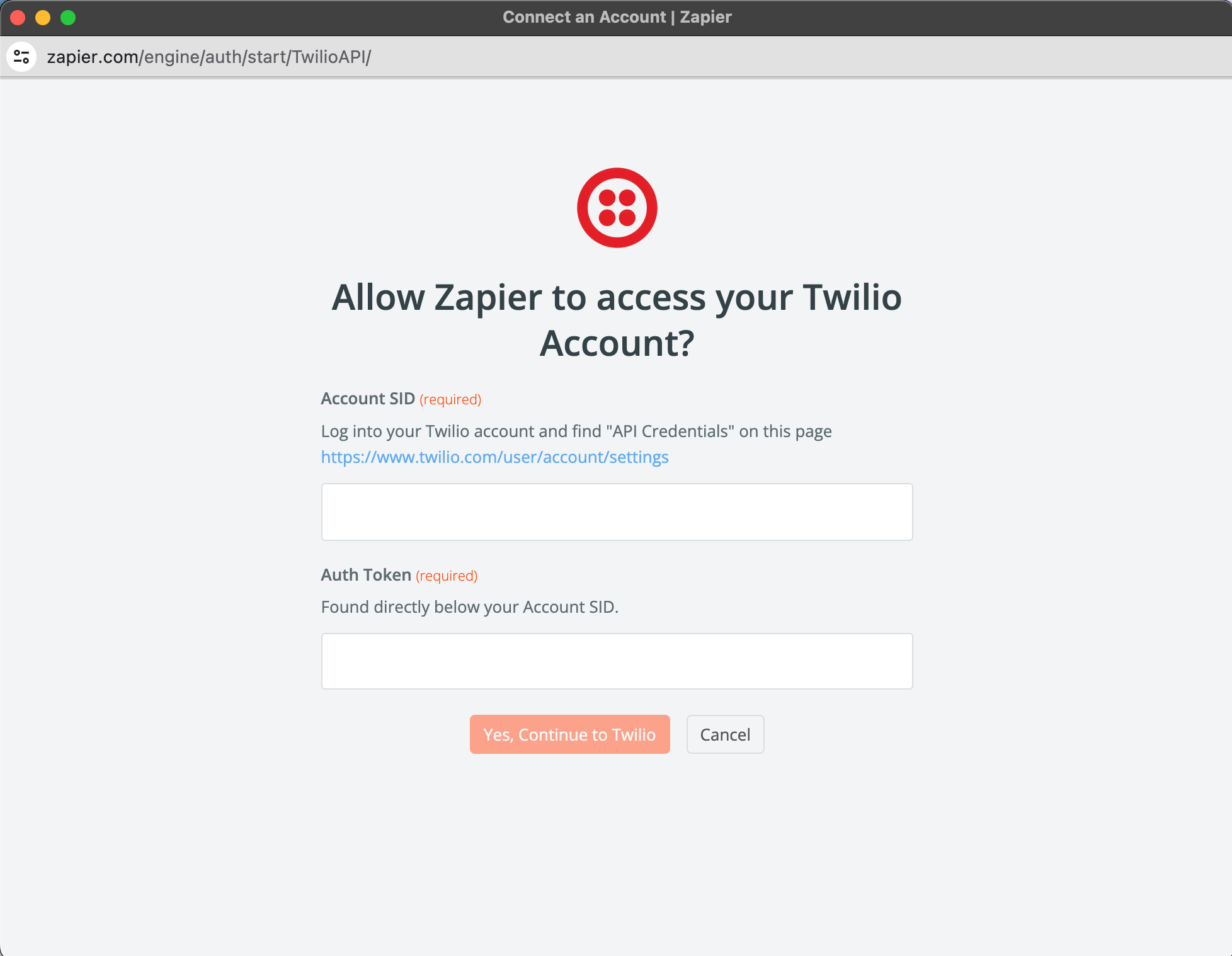 - Connect your Twilio credentials to Zapier