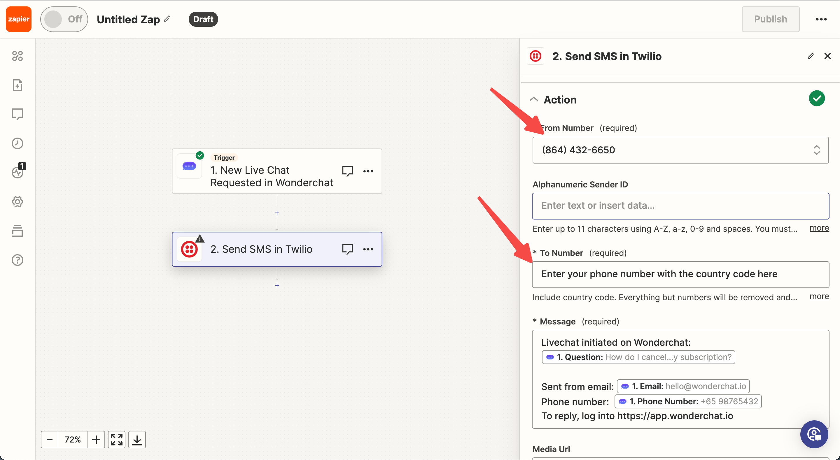 Anytime a new live chat requested is created in Wonderchat, send sms in Twilio. | Zapier