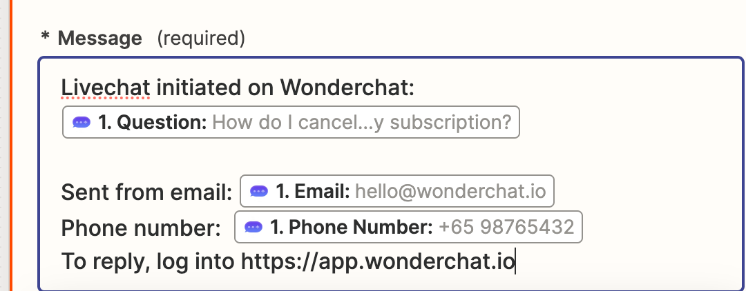 Livechat initiated on Wonderchat: Insert the Question field Sent from email: Insert the Email field Phone number: Insert the Phone number field To reply, log into https://app.wonderchat.io